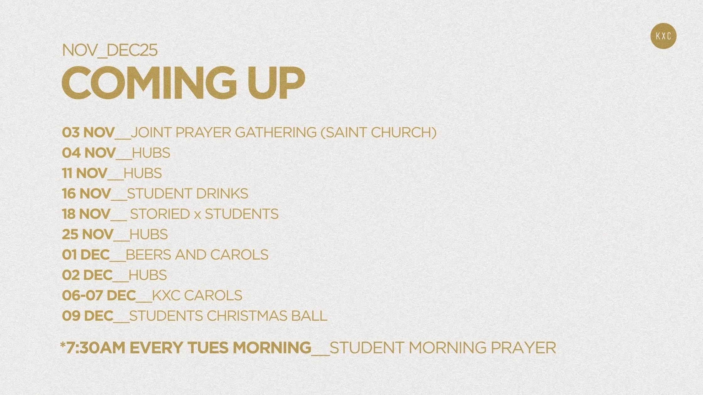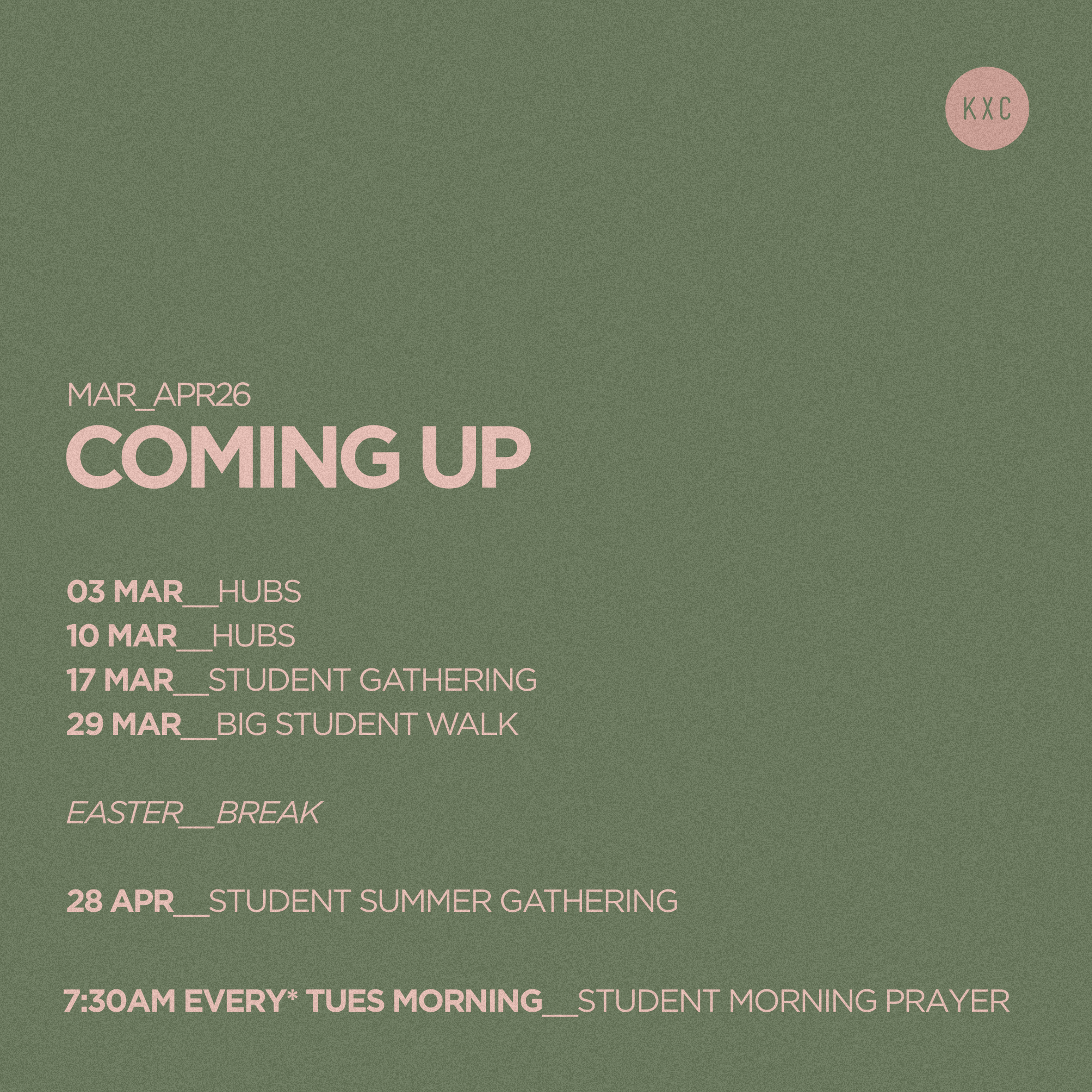 The best way to keep up to date about all things Students at KXC is via this webpage or on insta.