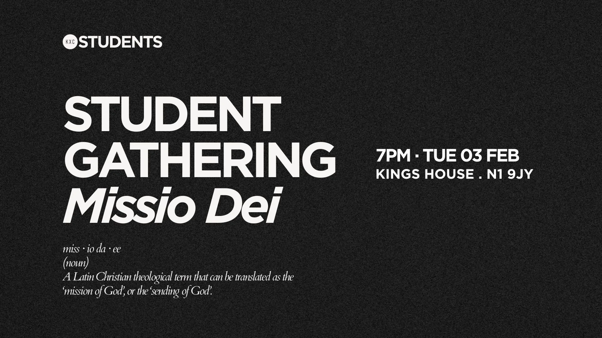 We’re so excited to be kicking starting our new student mini-series, 'Missio Dei' (the Mission of God). This is our first Student Gathering back of the Spring Term - and it'll be a time to connect over food, worship together, before hearing a sharing from scripture. This is our main space to form community and grow in faith as students (18-25s) at KXC.